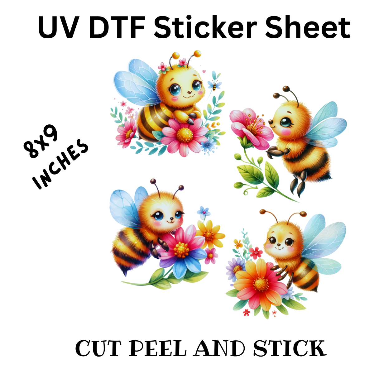 Floral Bee UV DTF Decal Sticker Sheet 8x9 inches