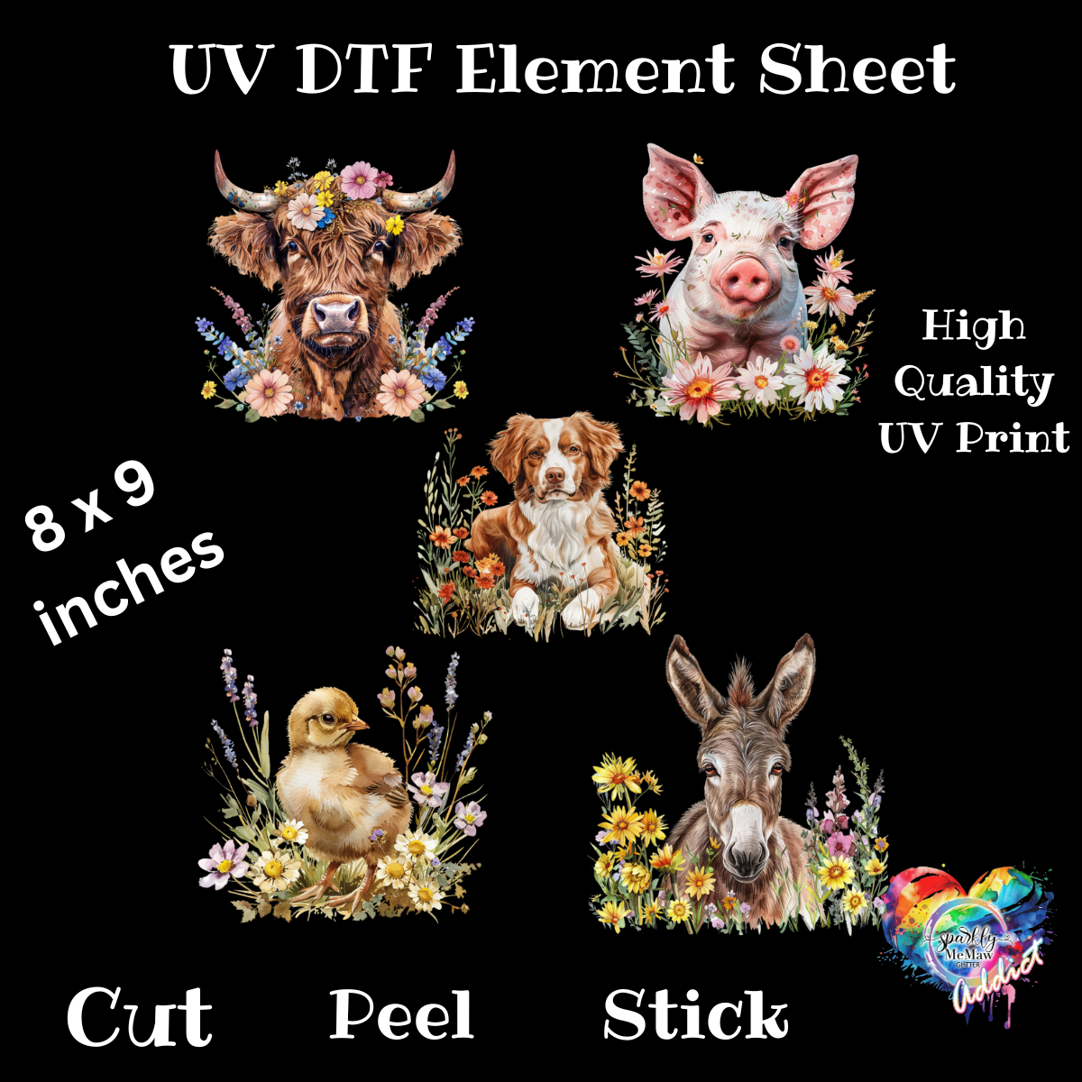 Floral Farm Animals UV DTF Element Sheet