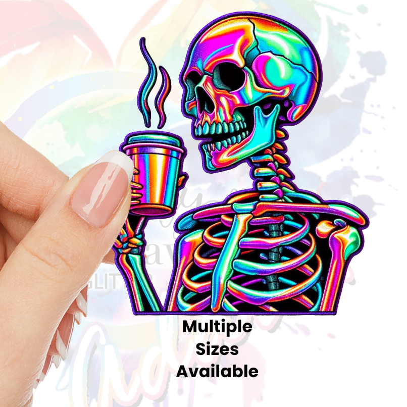 Holographic Skull drinking coffee (faux embroidery) Uv dtf Decal