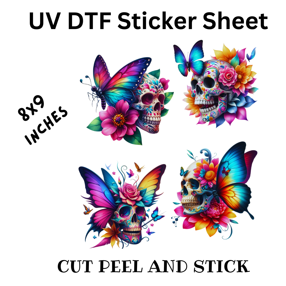 Vibrant Floral Skull UV DTF Decal Sticker Sheet 8x9 inches